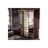 - Боковые откатные створки, декорированные серебряными зеркалами с еврокромкой, за которыми скрываются отсеки с хромированными штангами.